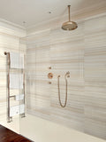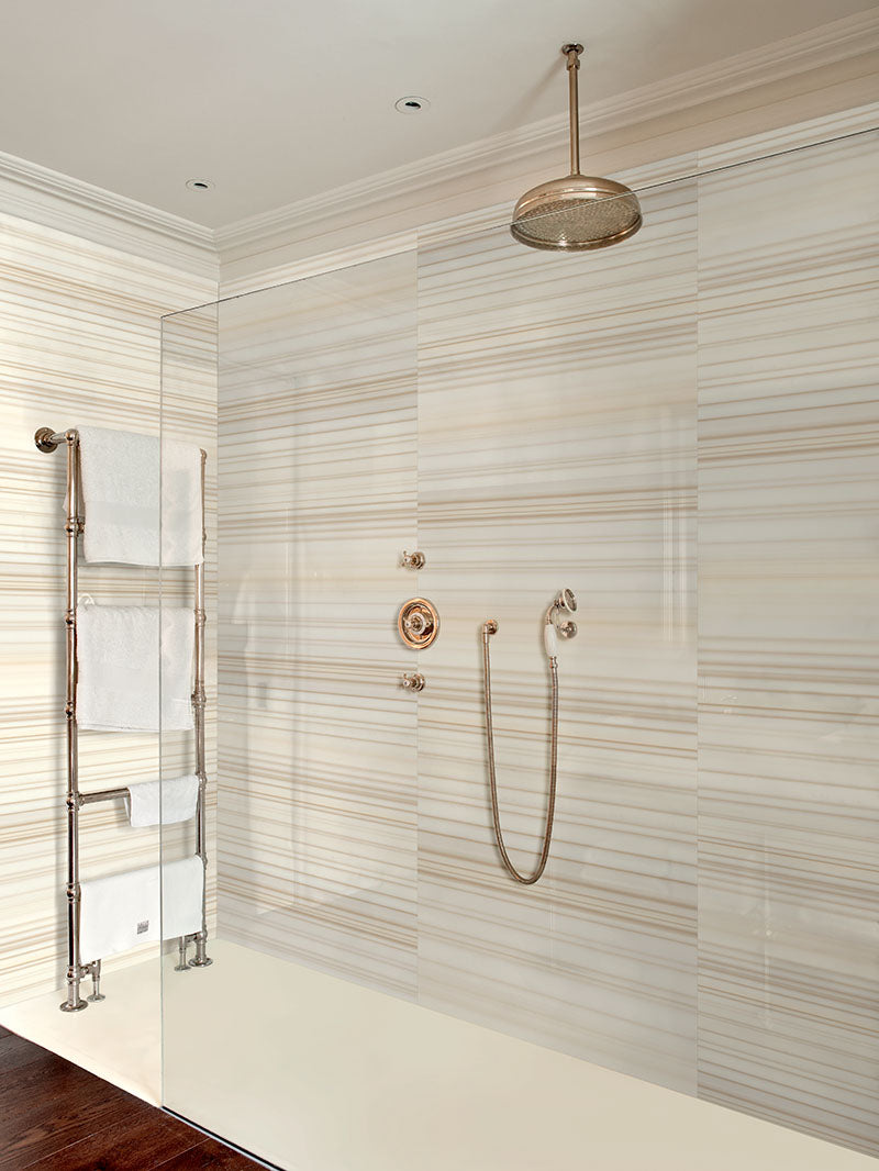 Variegated lines of tans and browns course evenly through the white surface for a dynamic, yet earthy, appeal.